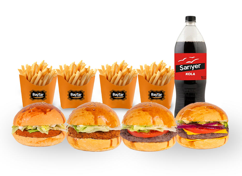 2 ADET TAVUK BURGER 1 ADET ŞEF BURGER 1 ADET ANADOLU ŞEF BURGER , 2 ADET PATATES KIZARTMASI , 1 LİTRE İÇECEK